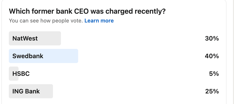 Based on a recent post "Swedish authorities charge former CEO of Swedbank for fraud and market manipulation" we ran a poll to find out whether our audience knew which bank's CEO was charged. We got a very high participation and the responses were quite varied.